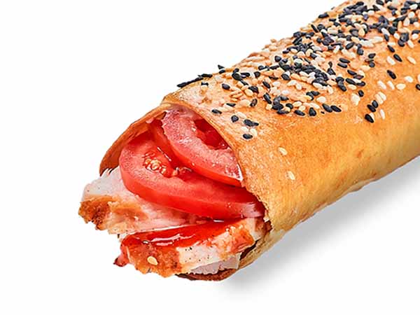 Запеченная лепешка пшеничнаяфиле куриное фрипомидоркунжутпродукт Моцарелламасло чесночноесоус сеульский